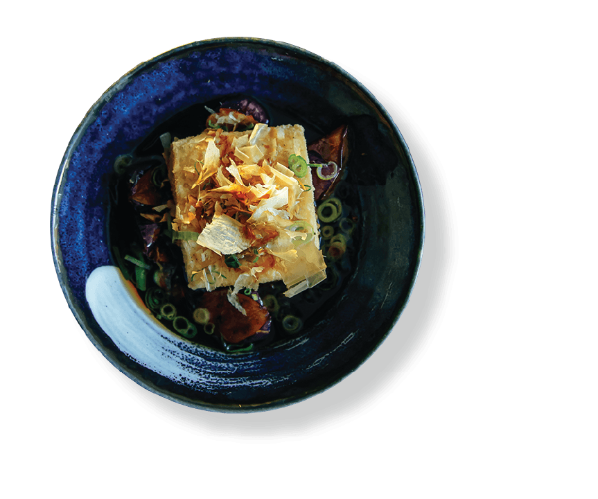 Tofu mou frit avec un dashi léger et flocons de bonites